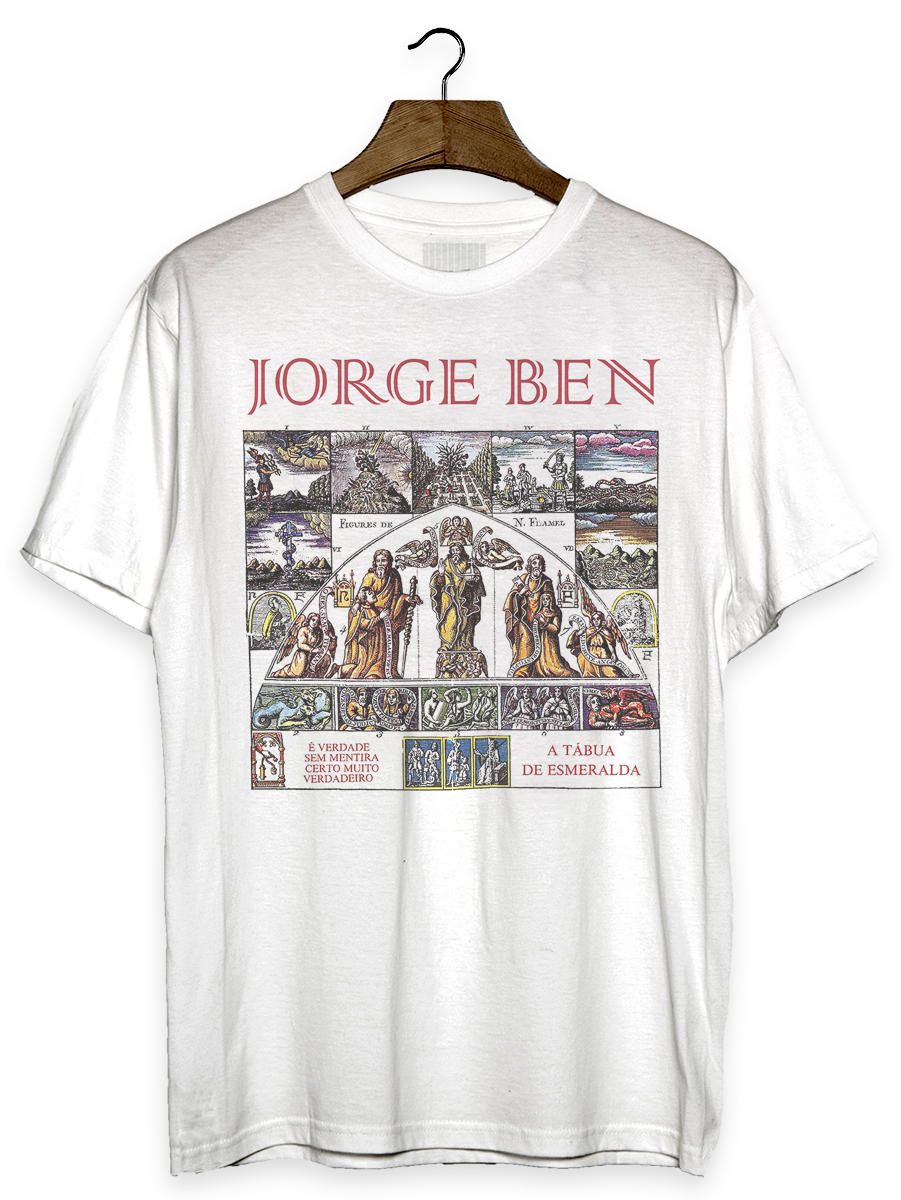Camiseta com estampa sobre o músico brasileiro Jorge Ben Jor. "A Tábua de Esmeralda" é o décimo primeiro disco de sua carreira, lançado em 1974, quando o mesmo usava apenas "Jorge Ben" como nome artístico. É um dos discos mais celebrados da música brasileira, por sua riqueza musical e temática.