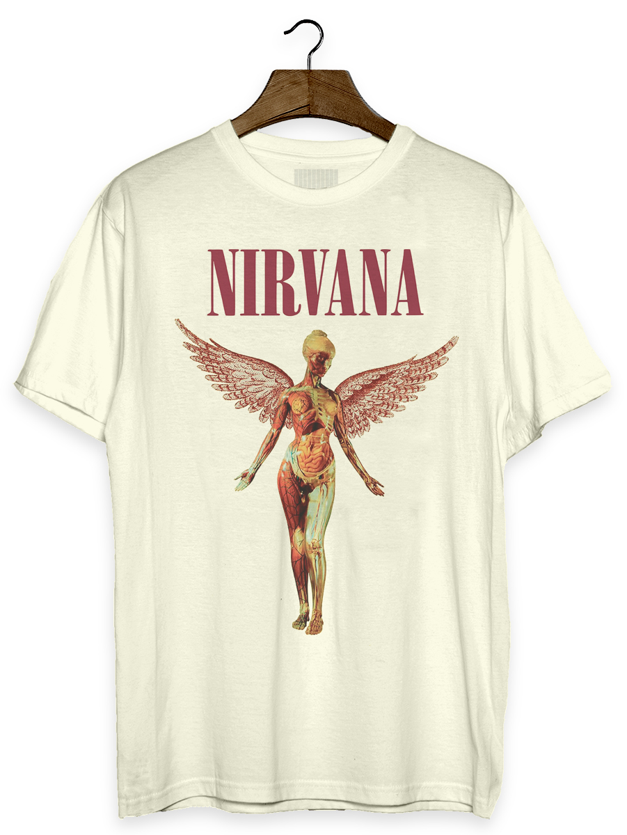 Camiseta com estampa sobre a banda Nirvana e seu último disco de estúdio, In Utero, de 1993, produzido por Steve Albini.