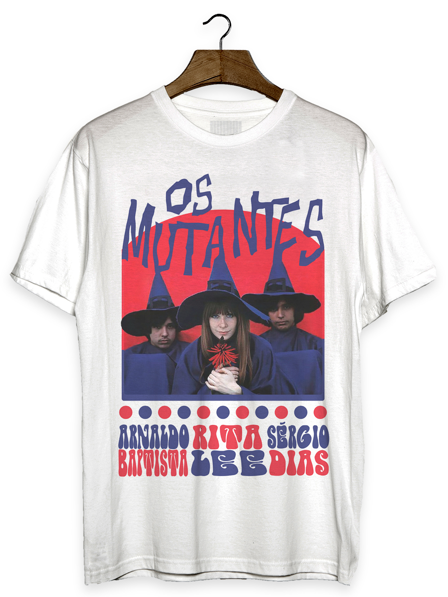 Camiseta com estampa sobre a banda brasileira de rock Os Mutantes, com teve em sua formação original Rita Lee, Arnaldo Baptista e Sérgio Dias.