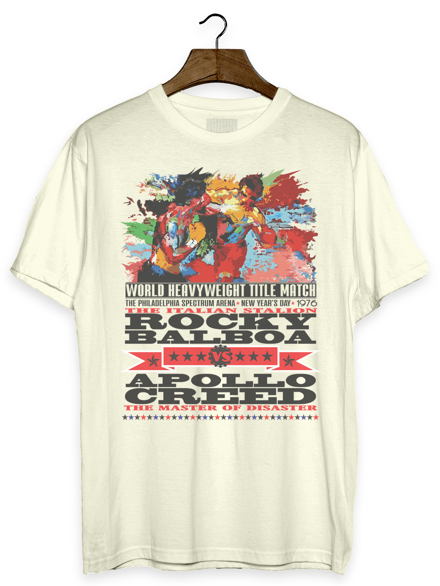 Camiseta com estampa sobre o filme Rocky, um Lutador, escrito, dirigido e interpretado por Sylvester Stallone, vencedor do Oscar de melhor filme em 1976.