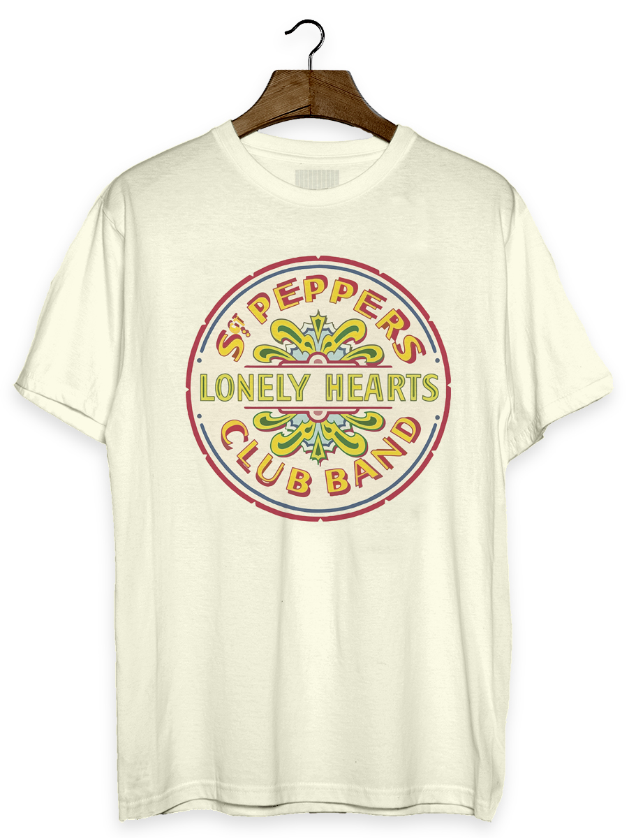 Camiseta com estampa sobre a banda The Beatles e seu disco Sgt Pepper's Lonely Hearts Club Band.