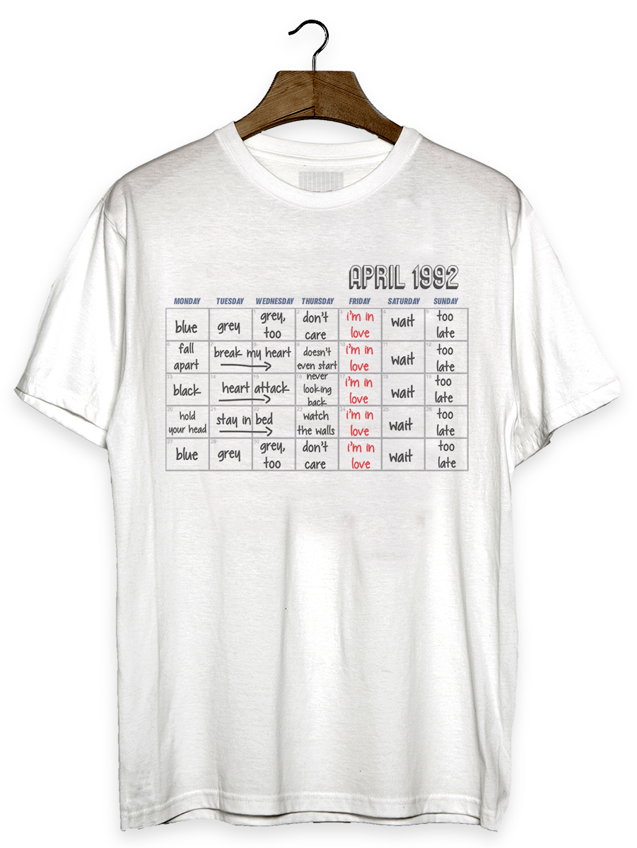 Camiseta com estampa sobre a banda The Cure e sua música Friday I'm in Love.