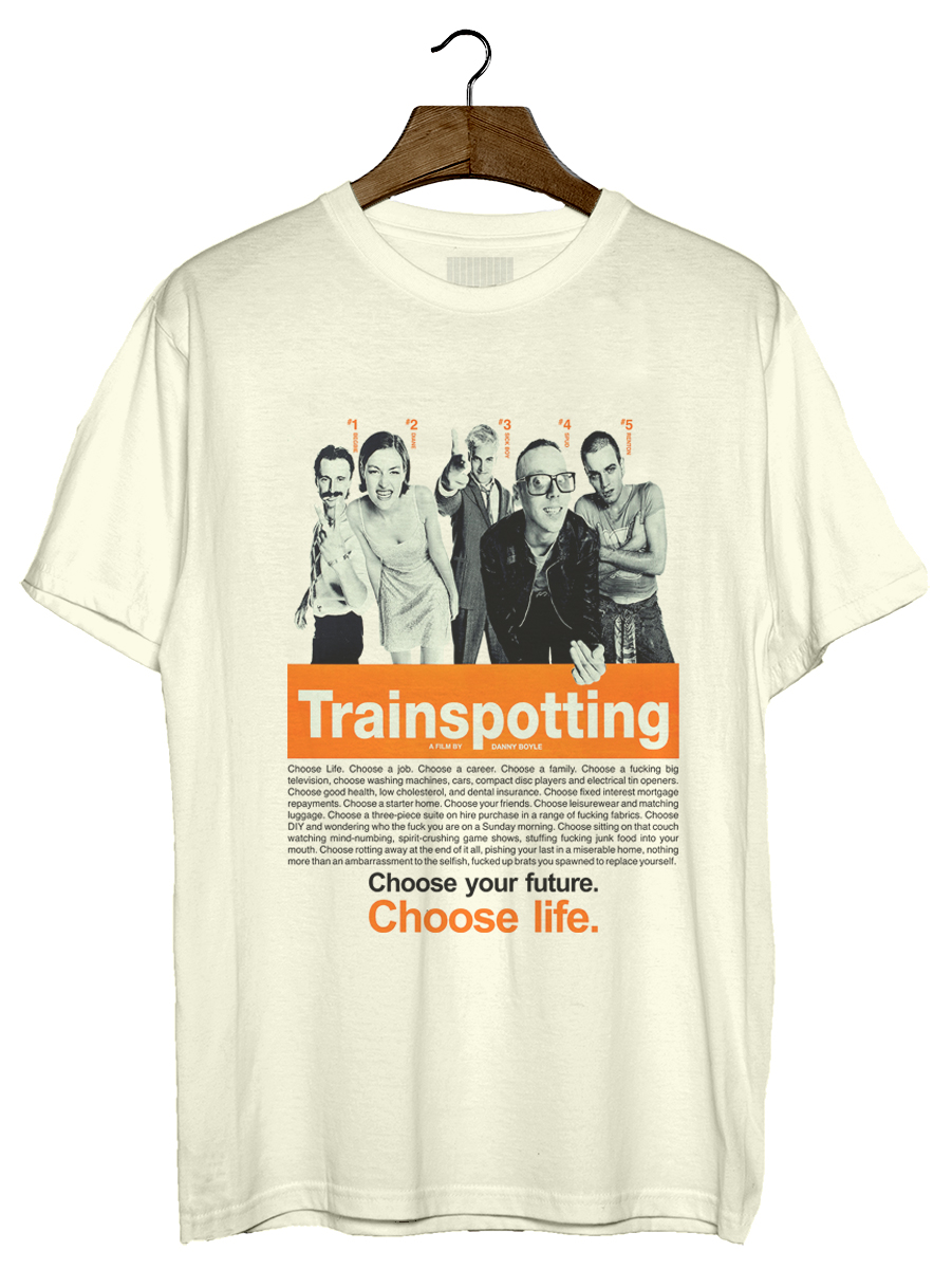 Camiseta com estampa sobre o filme Trainspotting, do diretor Danny Boyle.